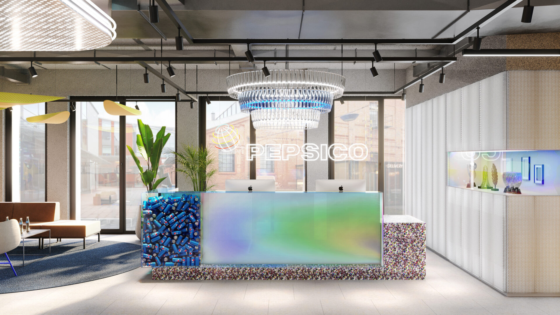 It is worth mentioning (and that’s also something you will definitely see when you take a look at our renderings), that the design concept was very extraordinary and in few cases we needed to find the best way of modelling certain objects in 3D. For instance, take a look at the reception desk: It is a plexiglass box filled with empty Pepsi cans.