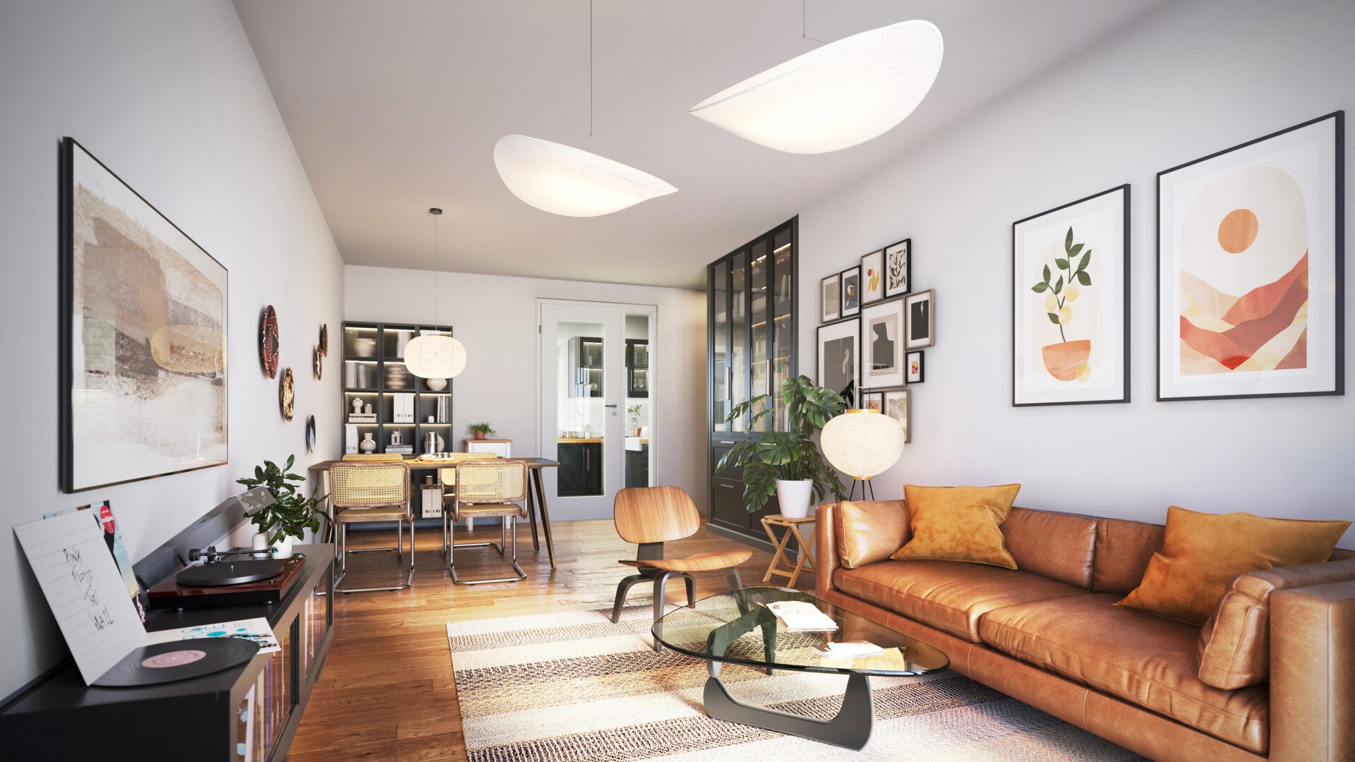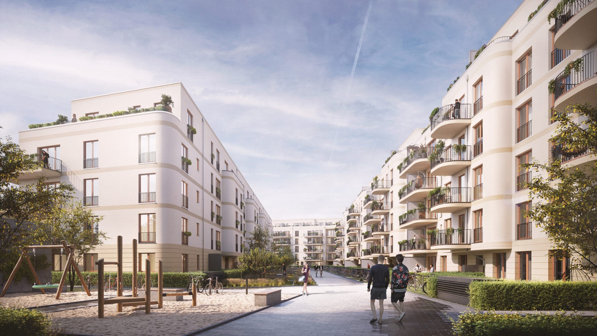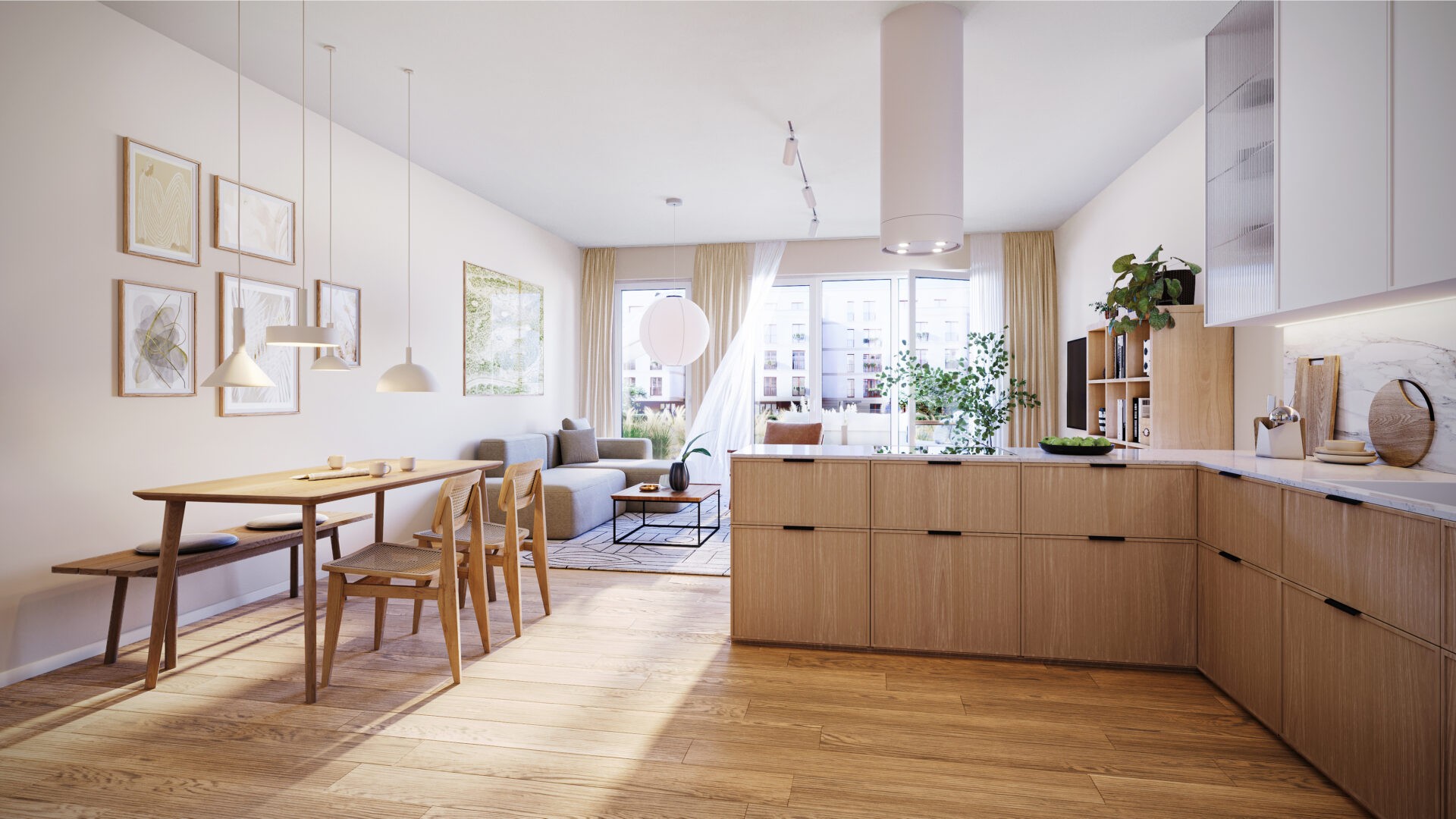 Another notable aspect of this project is that is was shown from a full spectrum of angles: from interiors, to eye level outdoors, all the way to bird’s-eye viewsof the entire complex (in cooperation with our drone operator). The interior design and apartment arrangements were all developed in our studio.