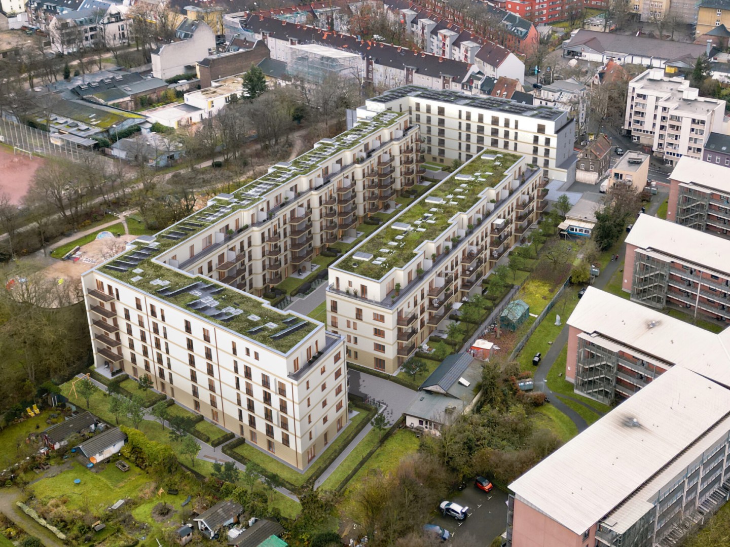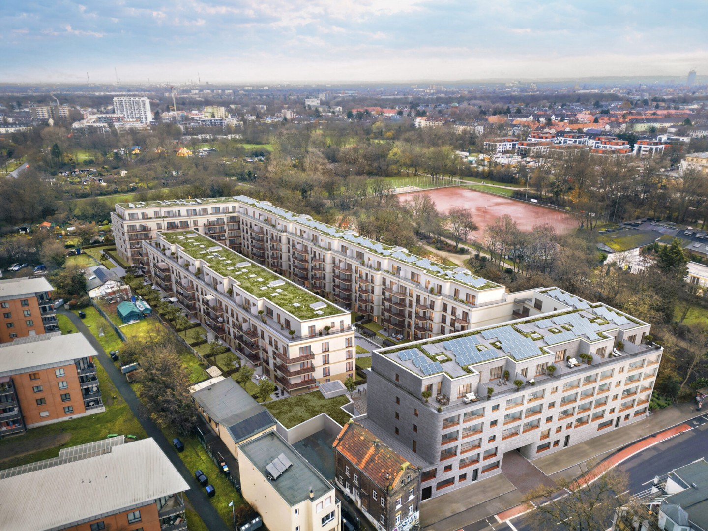 Nestled in the very heart of Ehrenfeld, a popular, charming, and vibrant district of Cologne, this project focuses on residents’ needs, providing accommodation to 149 families. Constructed with a blend of sustainable materials and high-quality finishes, each apartment is designed to offer a unique living experience. Every unit comes with its own balcony, loggia, or rooftop terrace. “Lück” pays homage to 1920s architecture with its façade details and rounded balconies, blending tradition with modernity.